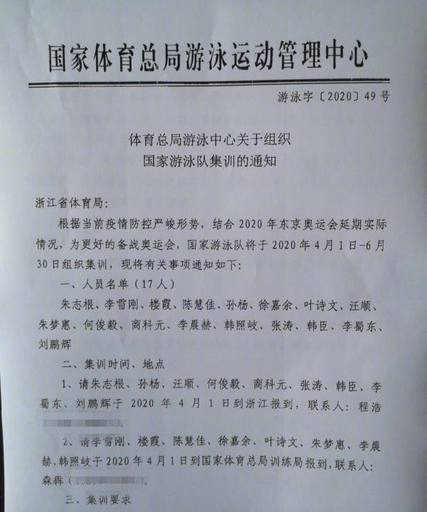 22日下午,在央视一档节目中,曾介绍了中国游泳队的奥运备战情况,并提到了此前被禁赛8年的孙杨不在奥运备战名单之中。但当天深夜,有国内媒体报道称,孙杨入选了国家游泳队的奥运集训名单,并贴出了游泳字〔2020〕49号文,其中列出了包括孙杨在内的17人集训名单。但在集训地点上,徐嘉余、叶诗文等运动员赴国家体育总局报到,而孙杨和同为朱志根教练指导的队员则留在浙江集训。