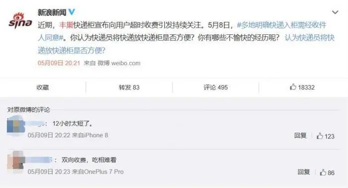 丰巢快递柜收费一事持续发酵。
