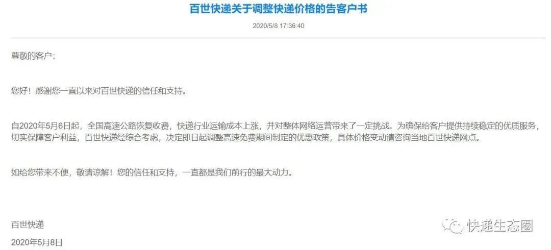 8日,百世宣布调整优惠政策,百世快递在告客户书中称:高速公路恢复收费,快递行业运输成本上涨,对整体网络运营带来了一定挑战,因此调整高速免费期间制定的优惠政策。