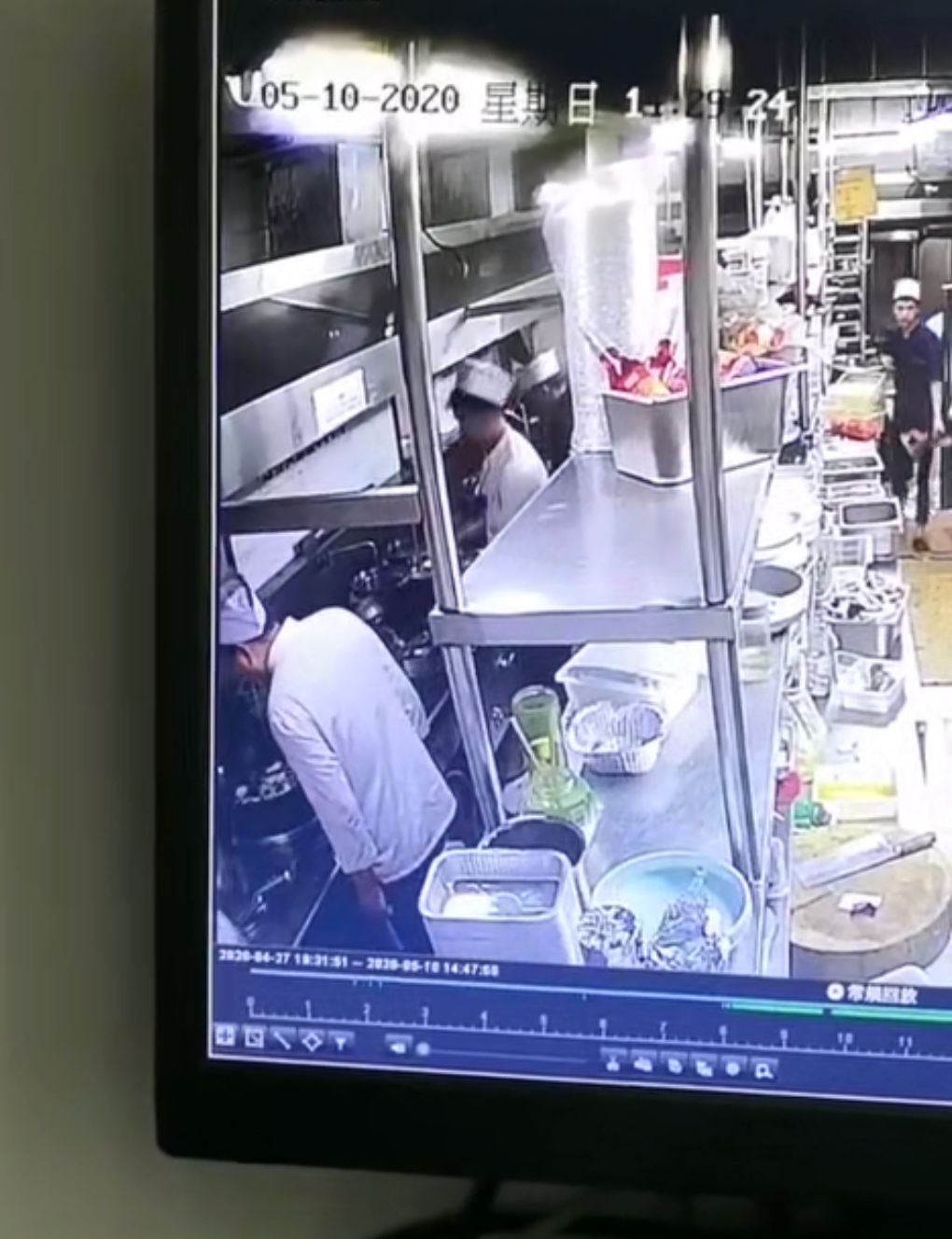 5月10日下午,郑先生一行人在西安市城南城市立方5楼的苏福记吃饭,因为在一道重新做的烩菜中发现有烟头,他查看监控发现更惊人的问题:“厨师在后厨不戴口罩,还向炒菜锅里吐口水。”