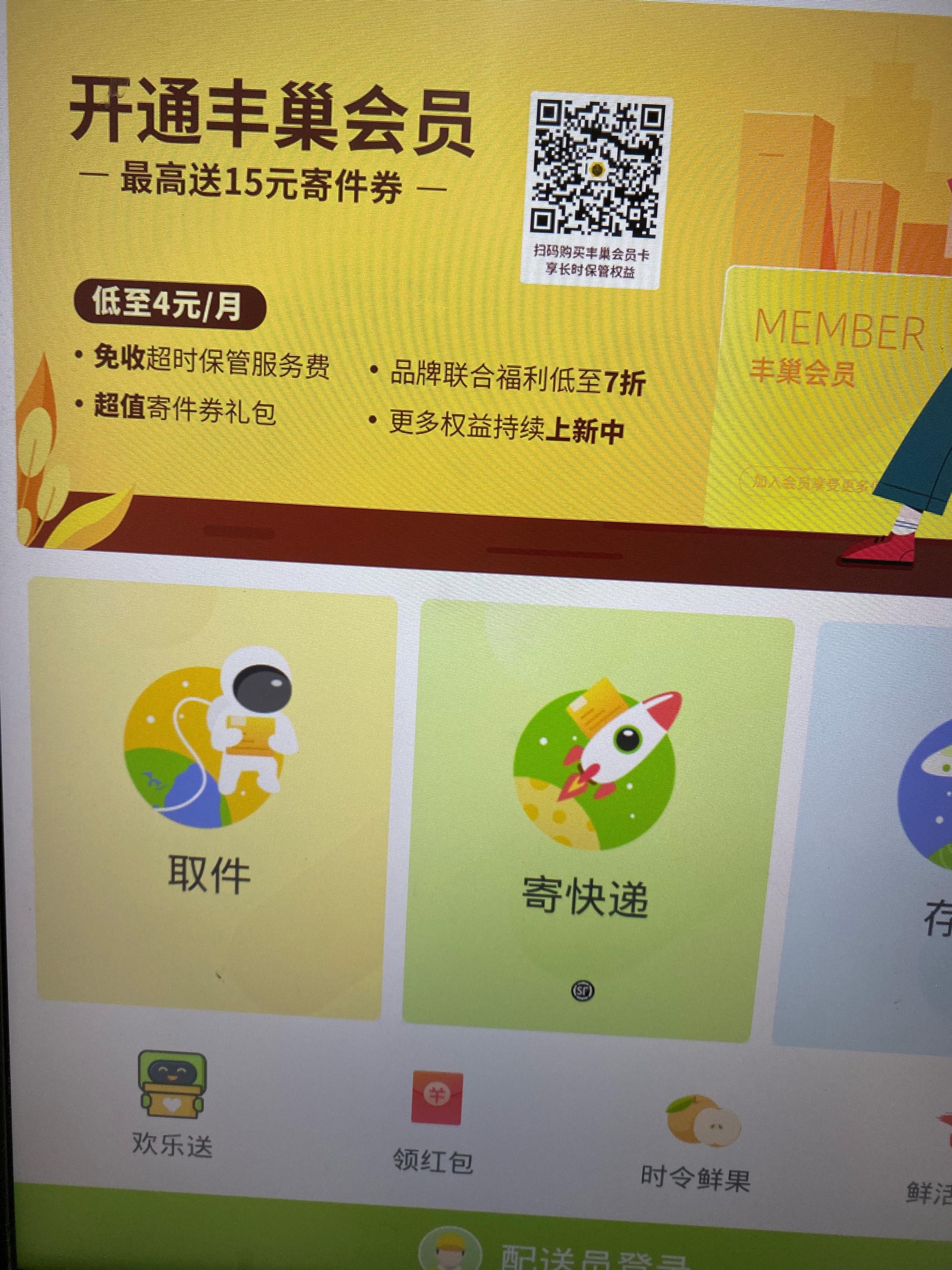 丰巢快递柜显示“收费开通丰巢会员、领红包等字样”。