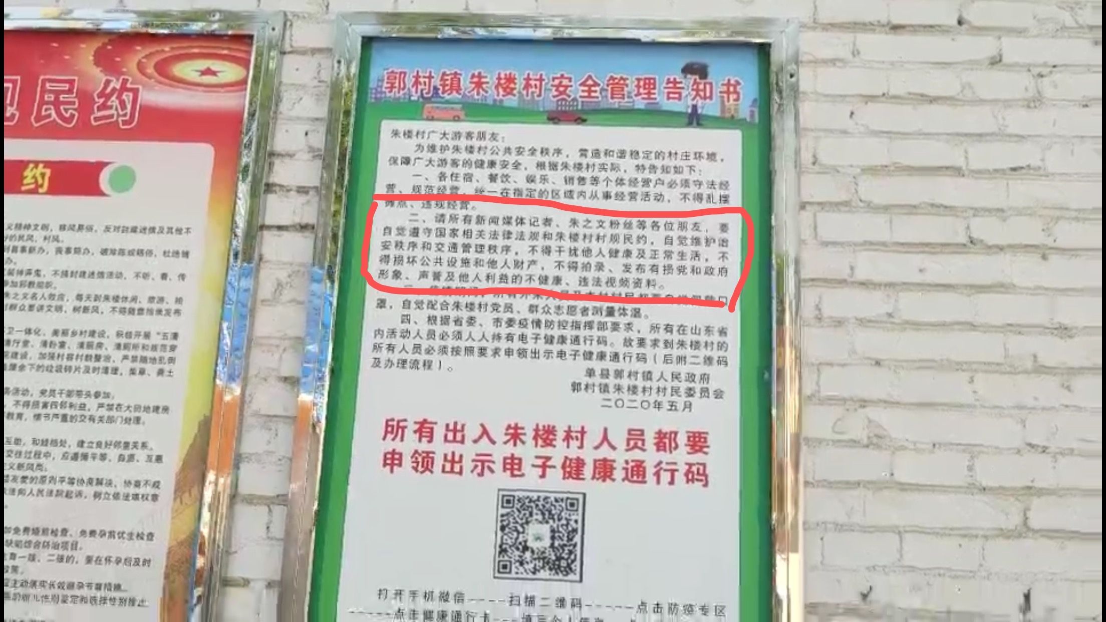 《告知书》提到,新闻媒体记者以及朱之文粉丝“要自觉遵守国家相关法律法规和朱楼村村规民约,自觉维护治安秩序和交通管理秩序,不得干扰他人健康及正常生活”,同时“不得损坏公共设施和他人财产”。