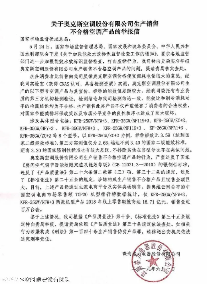 2019年6月10日,@格力电器 在官方微博上发布《关于奥克斯空调股份有限公司生产销售不合格空调产品的举报信》。(图1)