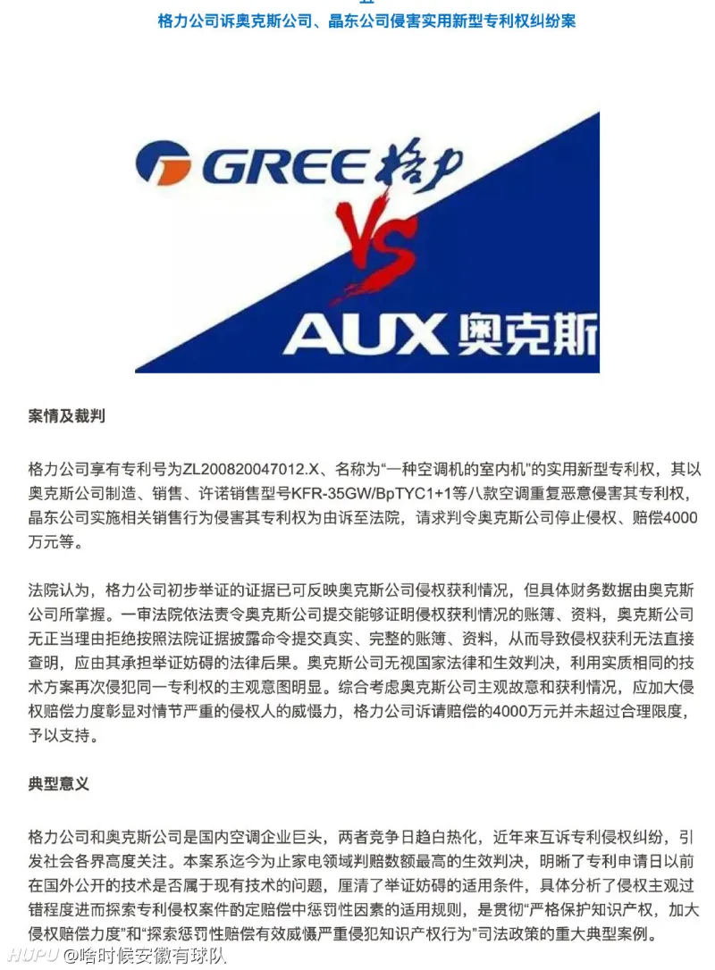 虎扑5月13日讯5月12日,历时3年多的格力诉奥克斯侵犯专利权一案终于尘埃落定。据中国裁判文书网资料显示,奥克斯恶意侵权成立,被判赔偿格力4000万元。新闻发出后引起了网友的广泛讨论,详细内容如下: