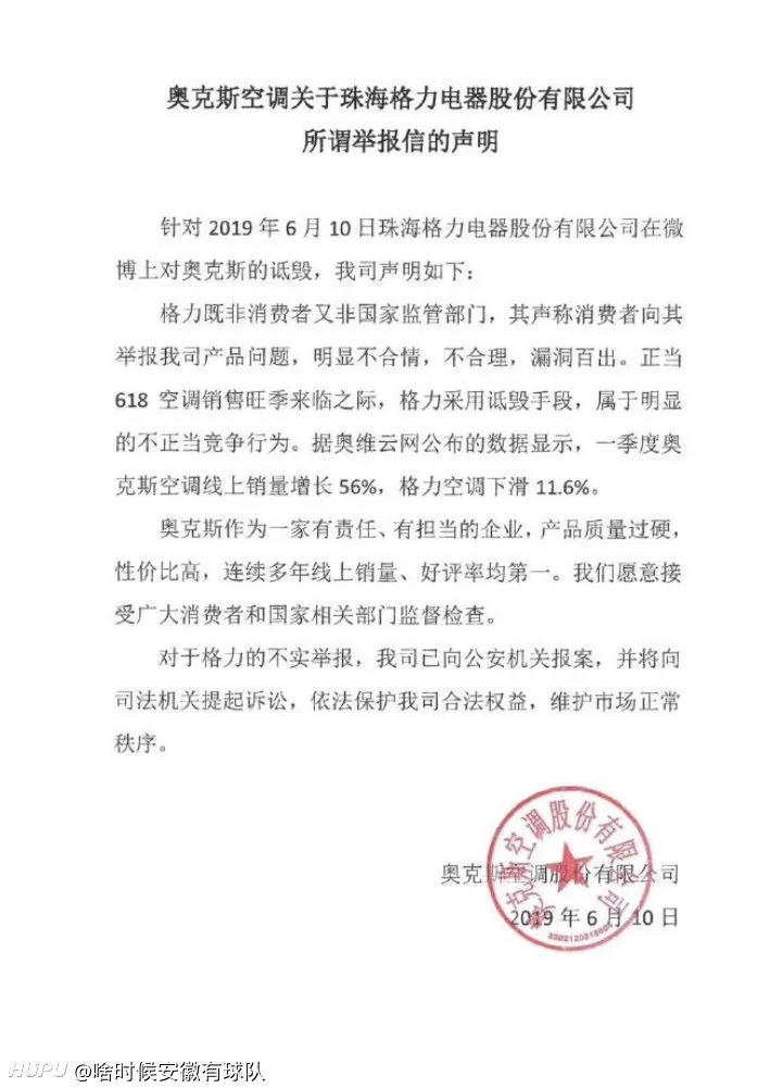 2019年6月11日,格力称举报奥克斯与618无关 若破坏公平竞争一定站出来。解释举报奥克斯原因:确实与员工跳槽相关。