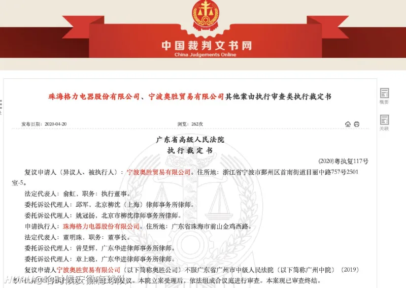 2020年5月12日,中国裁判文书网资料显示,广东省高级人民法院宣布维持原判,认定宁波奥胜贸易有限公司(原宁波奥克斯空调有限公司)恶意侵权成立,判决后者向珠海格力电器股份有限公司赔偿4000万元。
