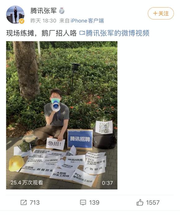 除了水滴和唱吧的老板亲自上阵,腾讯和滴滴也在大街上摆起了摊位。腾讯的摊位是招聘。