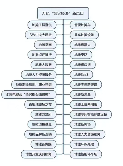如今,国内疫情散去,实体经济亟待恢复,地摊经济一夜爆红。从经济学的层面来说,地摊就像身体里的毛细血管,可以让每一个细胞参与代谢,对于整个经济体的生命力来说是很重要的基础。对此,有人甚至整理了一份万亿“烟火经济”产业链。