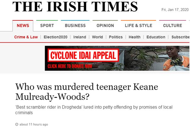 综合《爱尔兰时报》、英国《大都会报》16日报道,死者名叫基恩•穆雷迪伍兹(Keane Mulready-Woods),今年17岁,就读于德罗赫达镇社区学院。报道称,基恩于12日傍晚失踪,次日下午,他的姐姐在脸书上称,没有任何人能够联系上基恩。