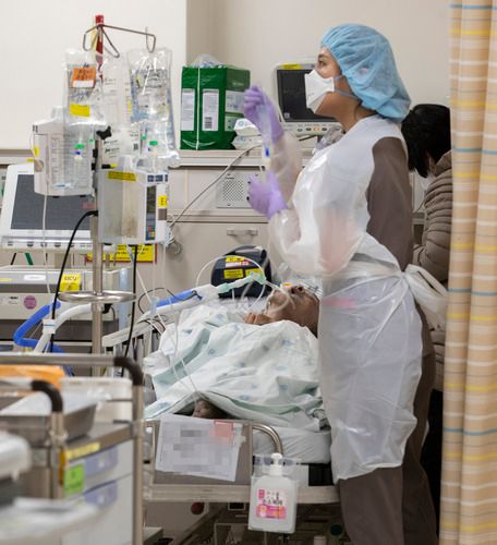 3月4日,在韩国大邱庆北大学医院,一名确诊患者接受治疗。新华社发(李相浩摄)