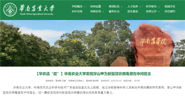 2020 年 2 月 7 日,华南农业大学针对新型冠状病毒肺炎疫情研究攻关情况举行了新闻发布会。会上,华南农业大学、岭南现代农业科学与技术广东省实验室沈永义、肖立华等科研人员表示,穿山甲可能为新冠病毒的潜在中间宿主。