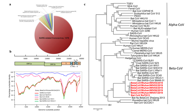 具体来讲,该团队从 5 名患者体内获得了 SARS-CoV-2 病毒的全基因组,发现这 5 例基因组基本上一致。SARS-CoV-2 在整个基因组中与在云南中华菊头蝠身上检测到的冠状病毒 Bat-CoV-RaTG13 有 96.2% 的一致性,与 SARS-CoV 有 79.5% 的一致性。