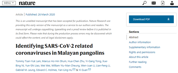 当地时间 2020 年 5 月 7 日,来自华南农业大学兽医学院、岭南现代农业科学与技术广东省实验室(包括其肇庆分中心)、广州动物园、中国农业大学生物学院农业生物技术国家重点实验室及广东省野生动物救护中心的研究团队于国际著名期刊《自然》在线发表了题为 Isolation of SARS-CoV-2-related coronavirus from Malayan pangolins(马来亚穿山甲中新冠病毒相关冠状病毒的分离)的论文。