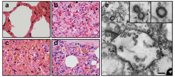 如下图所示,a 部分为阴性(健康状态),b、c、d 均为感染了 Pangolin-CoV 的状态,展示了肺泡上皮细胞和含铁血黄素色素的增殖和脱屑现象,其中 c 有严重的毛细血管充血。另外,e 为肺组织双膜囊泡的透射电子显微镜图像,右上角清晰可见冠状病毒。