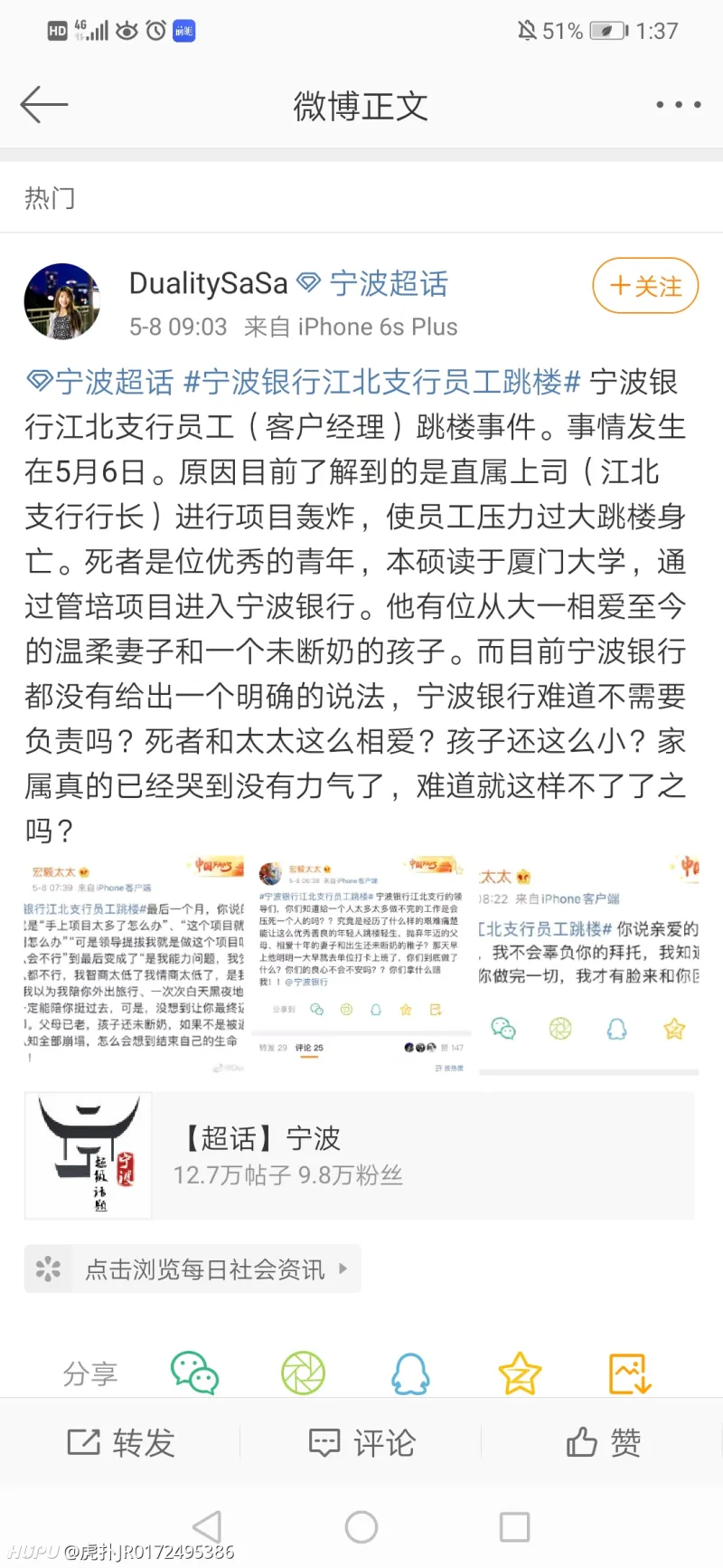 虎扑5月8日讯,5月6日,宁波银行江北支行员工跳楼,新闻发出后引起了网友的广泛讨论,详细内容如下: