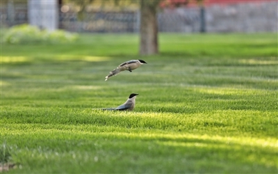 场景:一只喜鹊从另一只喜鹊上空飞跃而过,仿佛从身后跳跃而过。
