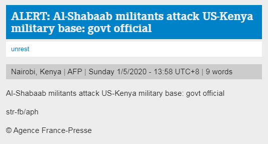 有军事消息人士告诉路透社说:“他们袭击了拉穆的紧邻军事营地的曼达机场跑道,那里(军事营地)有来自包括肯尼亚和美国的许多国家的军事人员。我们了解到,战斗仍在继续。”