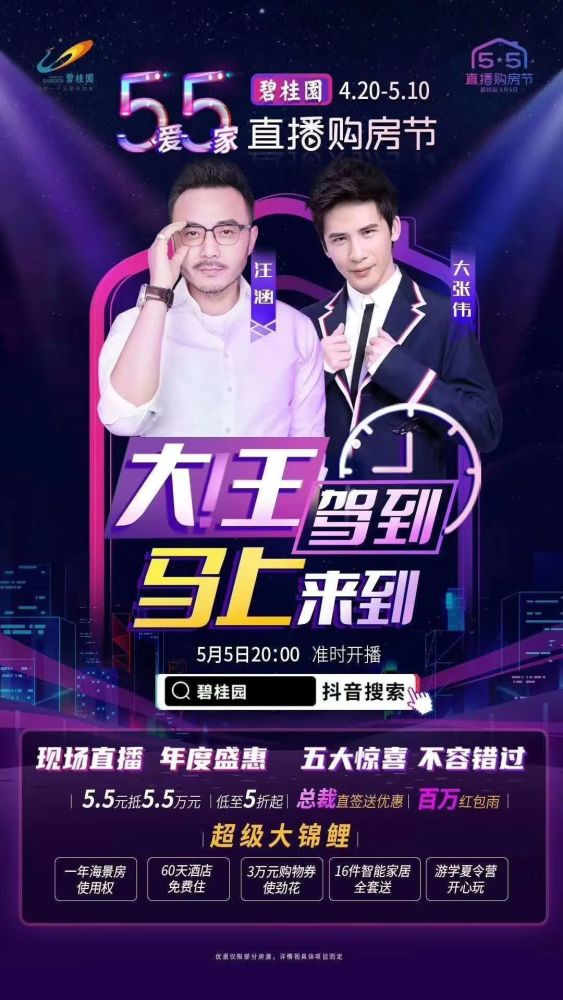 5月5日,立夏,年年此日一花开。这一天,碧桂园(02007-HK)做了一件吸眼球的事,令鹊卮媒朋友争相转播,就是《综艺顶流汪涵、大张伟空降碧桂园直播间 开启5.5购房狂欢节》。