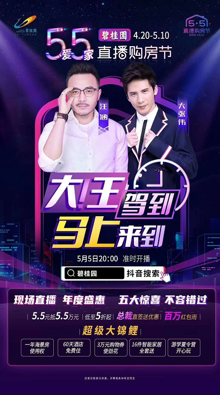 5月5日,立夏,年年此日一花开。这一天,碧桂园(02007-HK)做了一件吸眼球的事,令内地传媒朋友争相转播,就是《综艺顶流汪涵、大张伟空降碧桂园直播间 开启5.5购房狂欢节》。