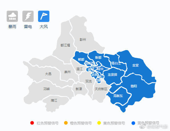 据@成都气象 微博消息称,成都市气象台9月13日3时40分发布大风蓝色预警信号:预计未来24小时,我市金牛区、成华区、武侯区、锦江区、青羊区、青白江区和高新东区的部分地方可能受大风影响,平均风力可达6级以上或者阵风7级以上。