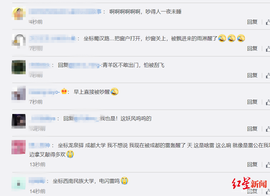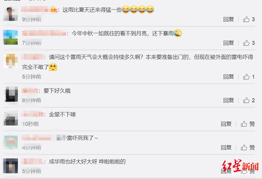 对于今晨的大风暴雨天气,微博网友们都纷纷留言,有人表示”今年中秋在成都看不到月亮了。“还有人表示,”还好今天中秋假期,早上没那么多人需要出门上班,大家出行的话要注意安全哦!“