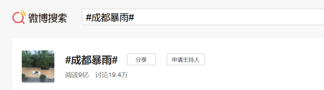 而小编发现,#成都暴雨#这个话题已上微博热搜,截至发稿时,阅读数达9亿,讨论数19.4万。