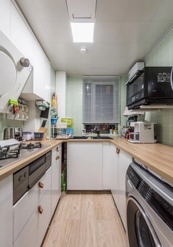 单看外观,它就是一个经典的“U”型橱柜设计,取、洗、切、菜、盛的动性功能规划合理。看到动图展示,橱柜的功能展示更是详细,原来的厨房面积没有这么大,扩容后,实现了女青年所有梦想,壁挂式大烤箱,还有洗碗机等等,这些都充分展现了“小空间的生活同样精致无比”。
