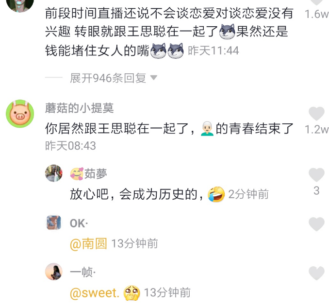 但是对于甜仇的这番间接回应,大家肯定也是有看法的。因为甜仇前段时间开直播的时候就明确提到,自己不会谈恋爱,也对恋爱没任何兴趣,但是转眼间就和王思聪在一起了,真的是没想到。