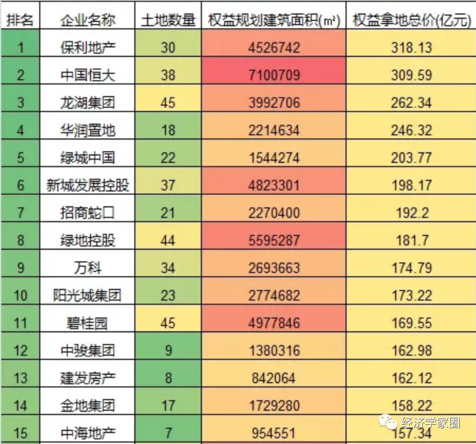 该数字远低于不少房企,如保利花费318.13亿元,斩获30宗土地位列第一;恒大投入了309.59亿元,收获了38宗土地位列第二。
