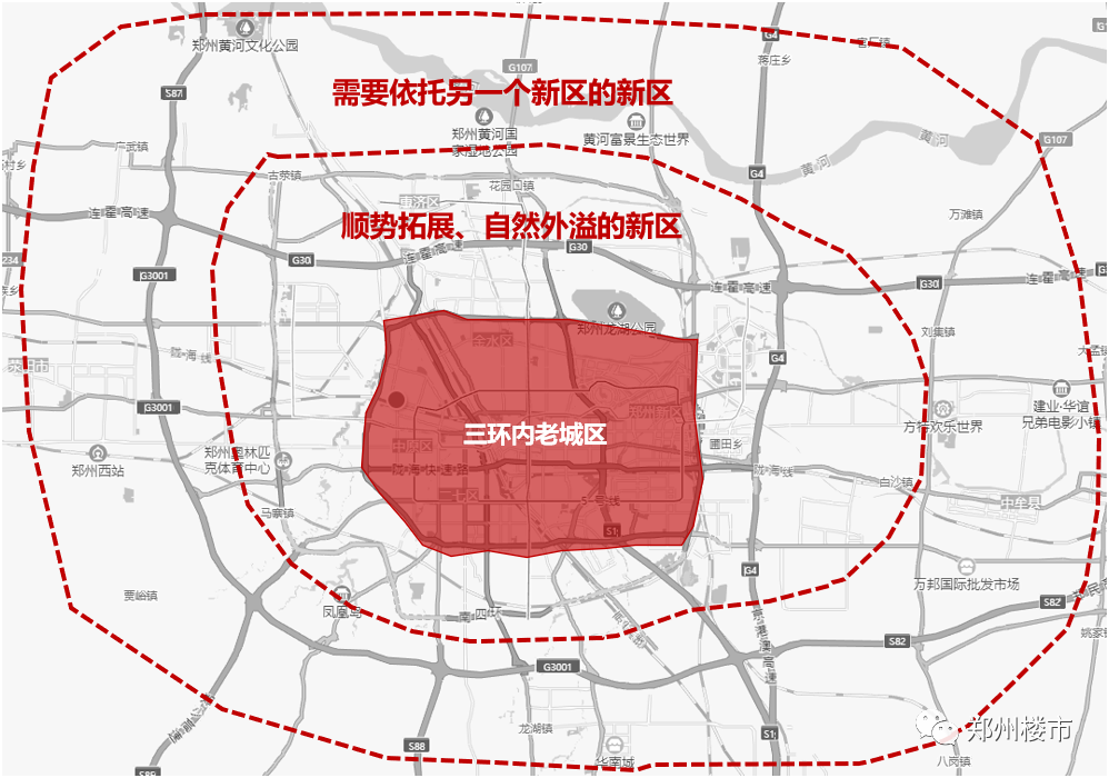 在三环内老郑州135平方公里外围,围着一圈新区,新区外又是一圈新区。