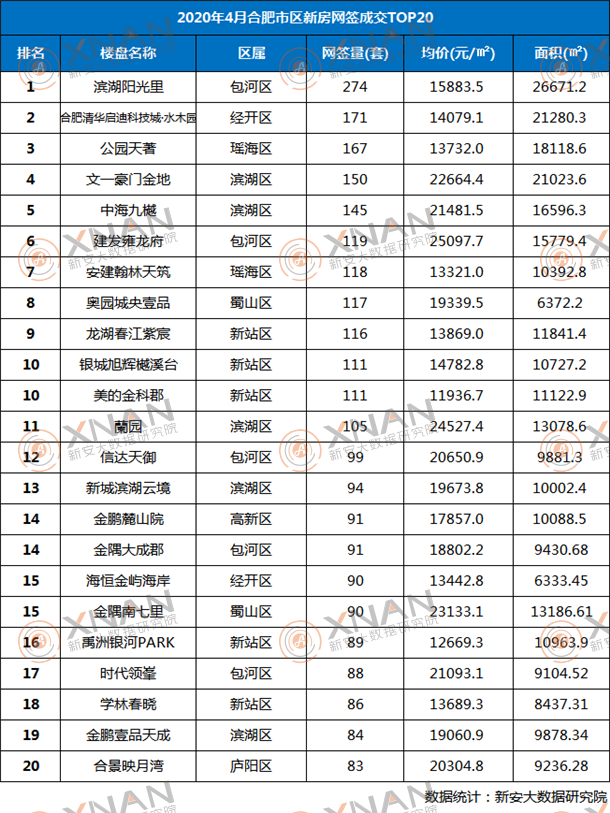 2020年4月合肥市区新房网签成交TOP20