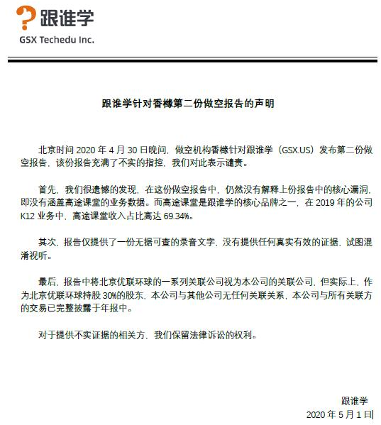 以下为跟谁学针对香橼第二份做空报告的声明全文: