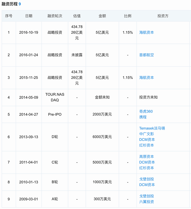 资本市场上,途牛也曾颇受追捧。2009~2016年间,途牛几乎以每年一轮的速度快速融资,资方中不乏DCM、红杉资本、淡马锡等大财团。直到上市后,依然引来了海航、首都航空等共计15亿美元的大额战略投资。