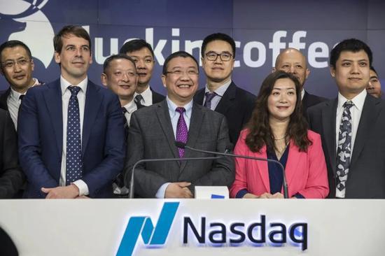 上市当天,陆正耀依旧是标志性的黑西装,他旁边围绕着 IPO 承销商的经纪人们,以及手捧瑞幸小蓝杯的 CEO 钱治亚。