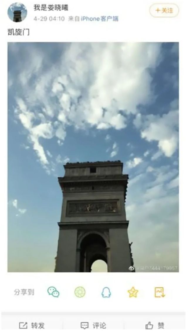 而@我是娄晓曦这一微博账号注册于4月27日,一共只发表过两条微博,第一条发表于4月29日凌晨4时,内容正是法国巴黎地标式建筑凯旋门。