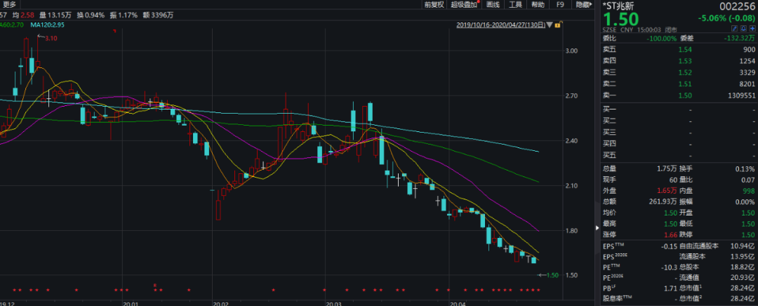 在2019年年报得不到一众董监高的认可之外,由于兆新股份2018-2019年度净利润均为负值,且被出具无法表示意见的审计报告,其在4月27日复牌后开始“披星戴帽”,也因此遭到了投资者的“嫌弃”。4月27日开盘后,*ST兆新直接一字式跌停,全天未能打开跌停板,以1.5元/股报收。年初至今,兆新股份股价跌幅已达到42.08%。