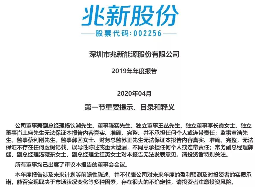 4月23日晚间,兆新股份发布2019年年报,开篇即是“重要提示”:共有12名董监高对年报提出异议,或“无法保证报告内容真实、准确、完整”,或“对报告无法发表意见”,并声称“不承担任何个人或连带责任”。值得注意的是,这也是兆新股份全部在任的董监高共同心声。