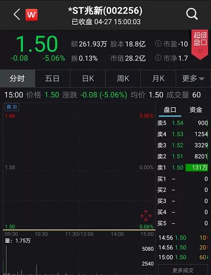 此外,由于兆新股份2018-2019年度净利润均为负值,且被出具无法表示意见的审计报告,其在4月27日复牌后开始“披星戴帽”,也因此遭到了投资者的“嫌弃”。4月27日开盘后,*ST兆新直接一字式跌停,全天未能打开跌停板。