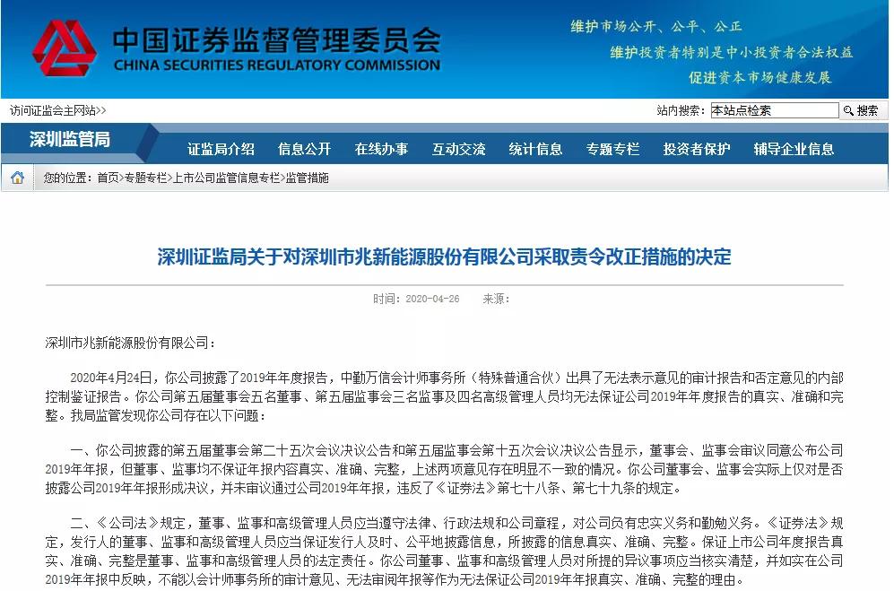 4月26日,由于2019年年报被审计团队出具“无法表示”意见,且12名董监高无法保证年报的真实准确和完整,深圳证监局对兆新股份做出采取责令改正措施的决定。