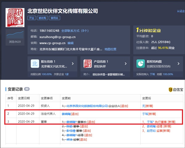 启信宝数据显示,4月29日,北京世纪伙伴文化传媒有限公司发生多项工商变更,娄晓曦卸任公司法定代表人和董事长职务,依旧担任公司经理,于瑶接任法定代表人;另外,陈颖、彭佳曈退出董事行列,于瑶新增为执行董事。梁洁不再担任监事,由赵思如接任。