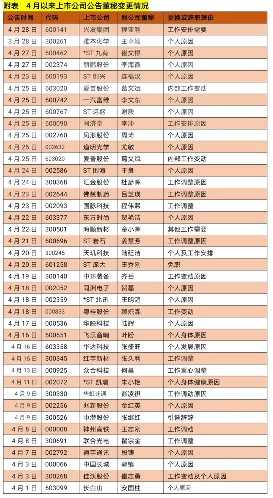 《红周刊》记者发现,自2020年1月1日以来,A股市场中已有70余家公司发布了董秘辞职或更换公告,仅4月份就有40多位。就这些董秘辞职或更换的原因看,既有“工作调动原因”,如 农业银行 前董秘周万阜;也有“个人原因”,如 雅本化学 前董秘王卓颖。当然,离职原因中还包括了因公司受罚而“引咎辞职”的,如 中潜股份 前董秘张继红。