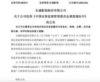 长城影视昨日发布公告称,公司于4月11日收到《中国证券监督管理委员会调查通知书》,因公司涉嫌信息披露违法违规,证监会决定对公司进行立案调查。