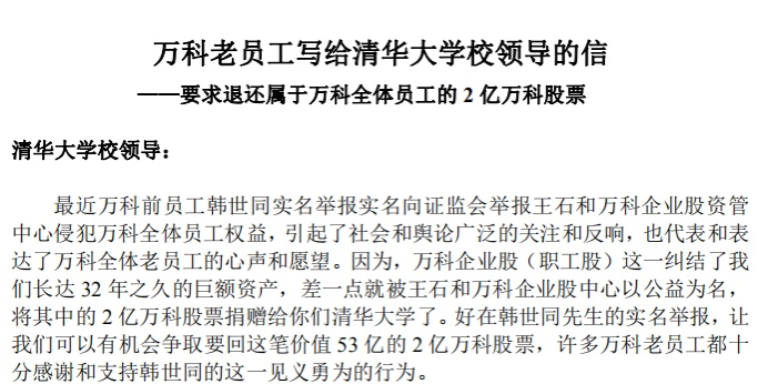 4月28日上午,10名万科老员工向清华大学校领导发出联名信件,称由于股权归属存在争议、捐赠程序有问题等,要求退换属于万科全体员工的2亿万科股票。