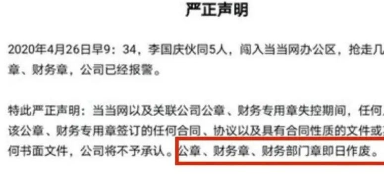 公章被“抢”后,当当网立刻到公安局报案,并发布声明称,李国庆所带走的公章、财务章、财务部门章作废。但对于这份回应,李国庆反将一军:没有公章的公司声明,均不能代表公司。