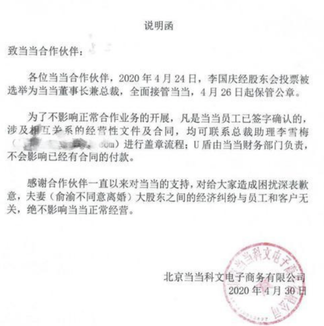 4月30日,网上流传的一份“说明函”则显示,李国庆“代表”当当向合作伙伴深表歉意,并称夫妻纠纷不影响正常经营。