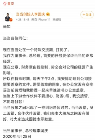 李国庆4月26日张贴在当当网的《告当当网全体员工书》中表示,“作为当当公司创始人及控股股东,李国庆先生已于2020年4月24日依法召开临时股东会,并做出决议,选举李国庆先生为董事长与总经理”。