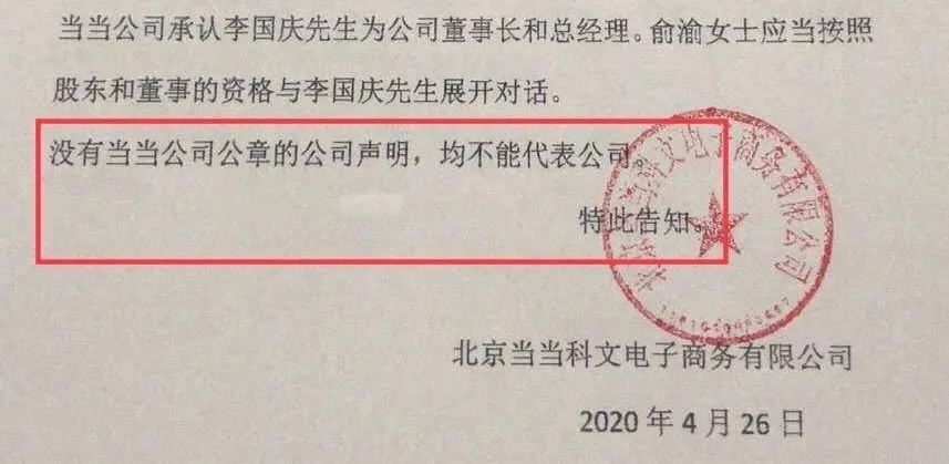 4月26日,李国庆率人上门抢当当公章,并在公司张贴《告当当网全体员工书》指出,李国庆全面接管公司,负责公司的经营管理。俞渝不再担任当当公司执行董事、法定代表人及总经理。俞渝无权在当当公司公司形式任何职权,无权向当当员工发出任何指示,无权代表当当公司对外做出任何意思表示或者行为。