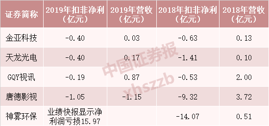 在目前的创业板股票中,“扣非净利润为负且营业收入低于1亿元”的个股共有4只,分别是金亚科技、 天龙光电 、 GQY视讯 、 唐德影视 。此外,尚未公布年报的神雾环保,业绩快报显示其亏损15.97亿元,2018年扣非净利润为负且营业收入低于1亿元。