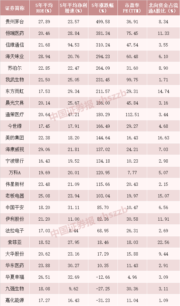 这25家上市公司,近5年平均ROE的平均值为21.46%,近5年平均净利增速的平均值为26.02%。值得一提的是,这25股都被北向资金持有,占流通A股比的平均值为7.13%。