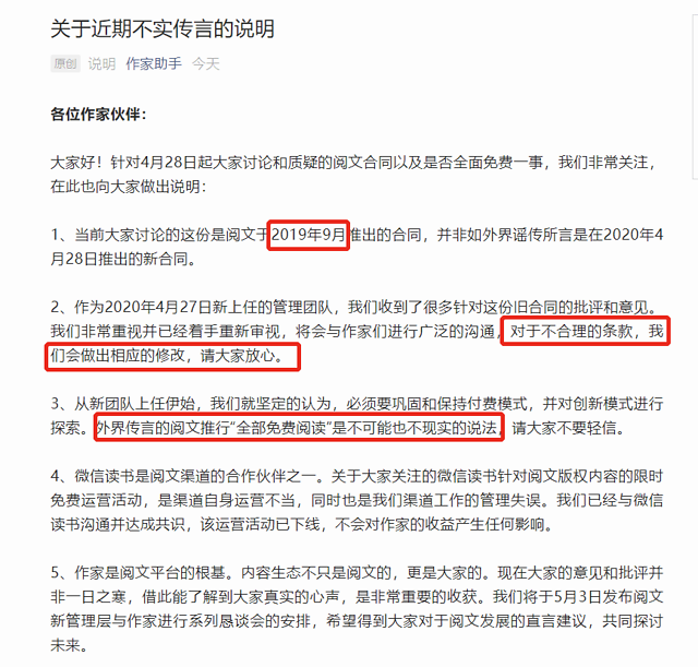 5月3日凌晨,阅文集团紧急回应,否认这是新管理层上任后推出的新合同,而是于2019年9月推出。同时,新管理团队已经收到针对这份旧合同的批评和意见,对于不合理的条款,阅文承诺会做出相应的修改。